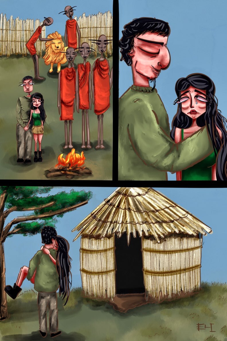 C’est à Masai-mars, dans un village Masai que l’aspect sauvage de l’Afrique reprit la vedette à la carte postale. Un vieux lion se mit à courir à travers les manyattas (maisons traditionnelles masai), dans la direction de nos deux amoureux et d’un groupe de guerriers en pleine représentation de danse. Rose fut prise de panique et bien que moins démonstratif, Phil eut un moment la peur au ventre avant que tous deux ne découvrent que Clarence était inoffensif et courait juste vers le chef du village, celui qui l’avait recueilli alors qu’il n’était encore qu’un lionceau. Rose, très apeurée retrouva ses esprits dans les bras de Phil après une brève mais authentique coulée de larmes. Hélas, la dissonance de l’incident provoqua chez la belle, de nouvelles visions et une crise bien plus forte que celle de New-York. Elle fut prise de tremblements et de soubresauts violents et se mit à délirer. Rose, dans les bras de Phil et dans un état second :