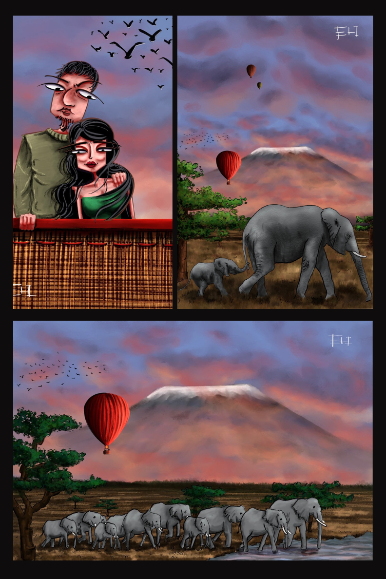 Rose gardait les mains légèrement au-dessus de ses épaules et complètement habitée par ses visions, les déclinaient avec une précision qui laissa notre éléphant sans voix. Avant cette minute, il ne lui avait parlé de rien. Il n’avait lâché aucune information susceptible de donner à Rose la possibilité de découvrir avant l’heure ce qu’il souhaitait présenter comme une surprise totale. Notre vieil éléphant était tout simplement scotché, médusé par la véracité des révélations de Rose qui concordait exactement avec la feuille de route qu’il avait soigneusement préparée avec l’agence de voyage et dans une discrétion totale. De plus, il avait tout préparé la veille seulement de son départ pour New-York. Il était impossible à Rose de. Savoir quoi que ce soit sur ce périple. Pourtant, la belle, comme envoutée, continuait de plus belle à tracer toutes les étapes de leur safari. Chacune d’elles était agrémentée d’anecdotes sur des moments privilégiés. Bien que littéralement absorbé par le récit, Phil eut lui aussi une vision. Elle ne faisait en rien appel à un phénomène paranormal mais le mis en alerte rouge. Il devait stopper son récit avant que celle -ci n’arrive au point culminant de leur voyage. Le vieil éléphant avait également ajouté une dernière surprise à ce voyage et celle-ci devait rester une surprise. Il décida d’interrompre brutalement sa dulcinée :